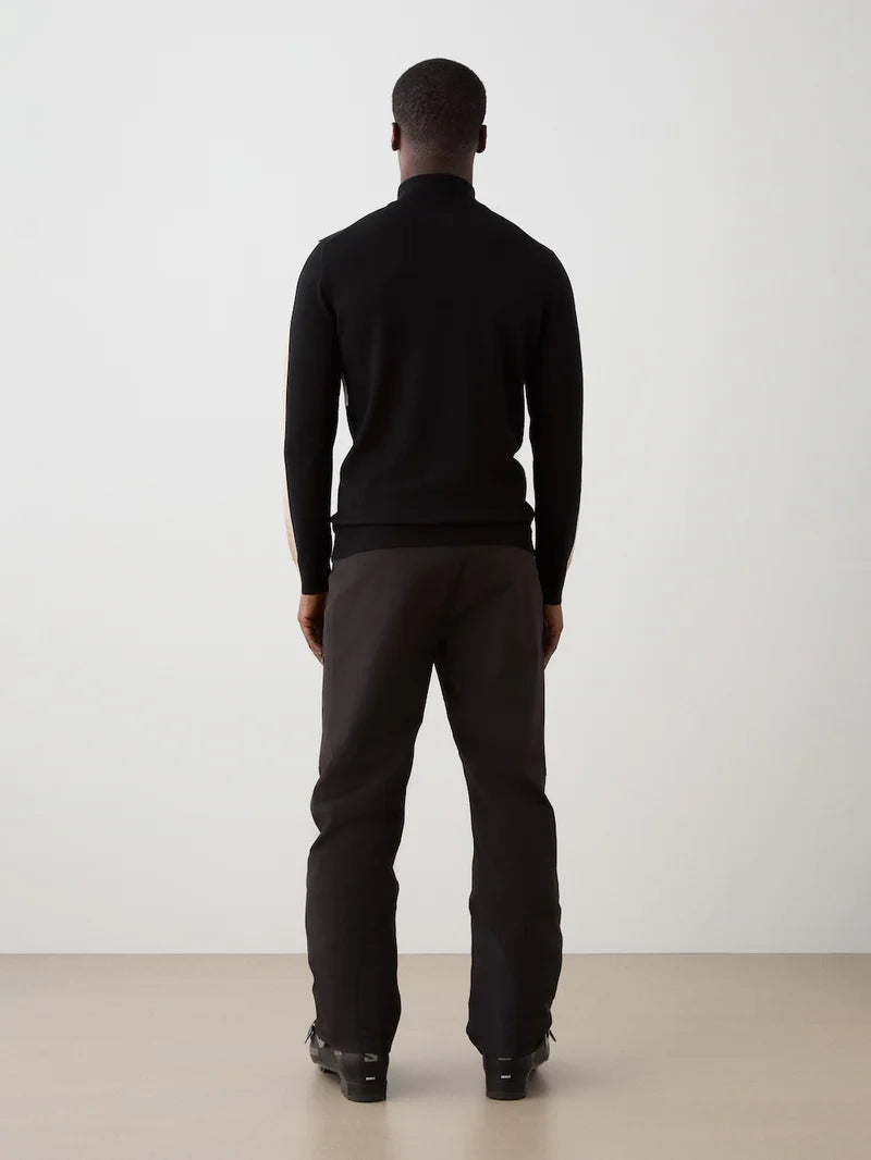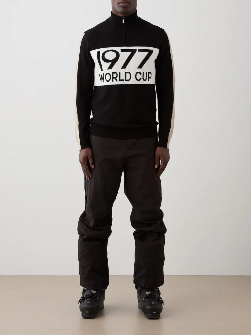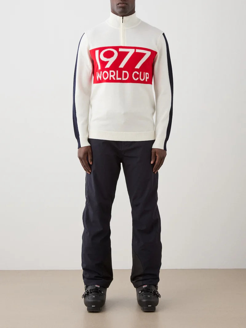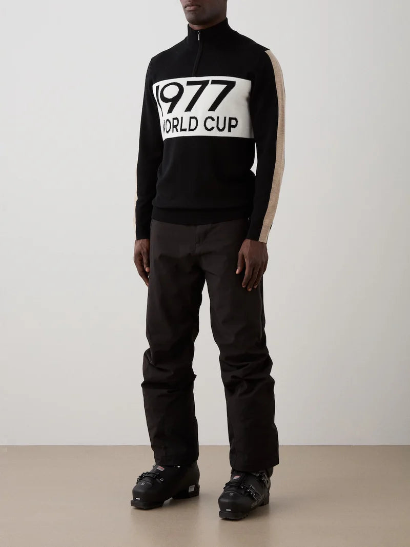 The Men’s Worldcup Sweater blends classic alpine style with modern comfort. Knitted in 100% superfine merino wool, it delivers exceptional softness, warmth, and breathability — making it ideal for long days on the slopes or relaxing après ski. Designed with a stand collar and a 1/4th front zipper, it offers easy temperature regulation, while the relaxed fit ensures all-day comfort. Available in four distinct colorways, this ski sweater is a versatile piece you’ll reach for season after season. Pair it with any of our ski pants for an effortlessly retro-inspired ski look.
