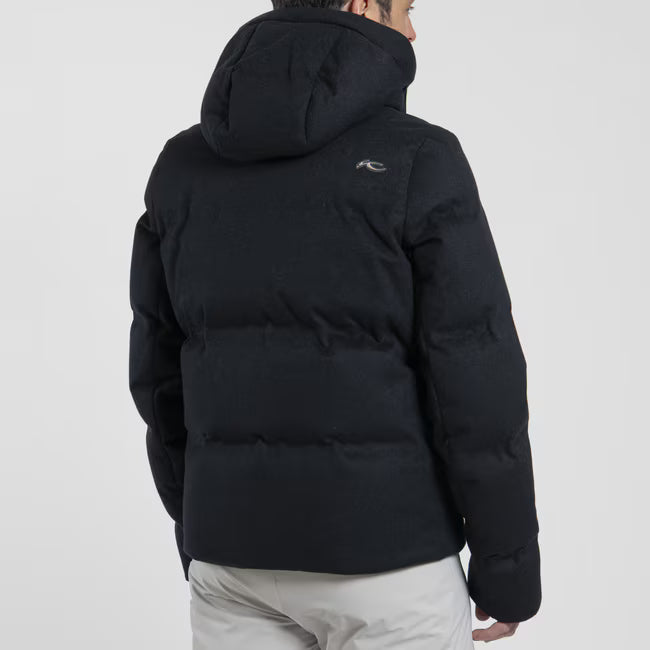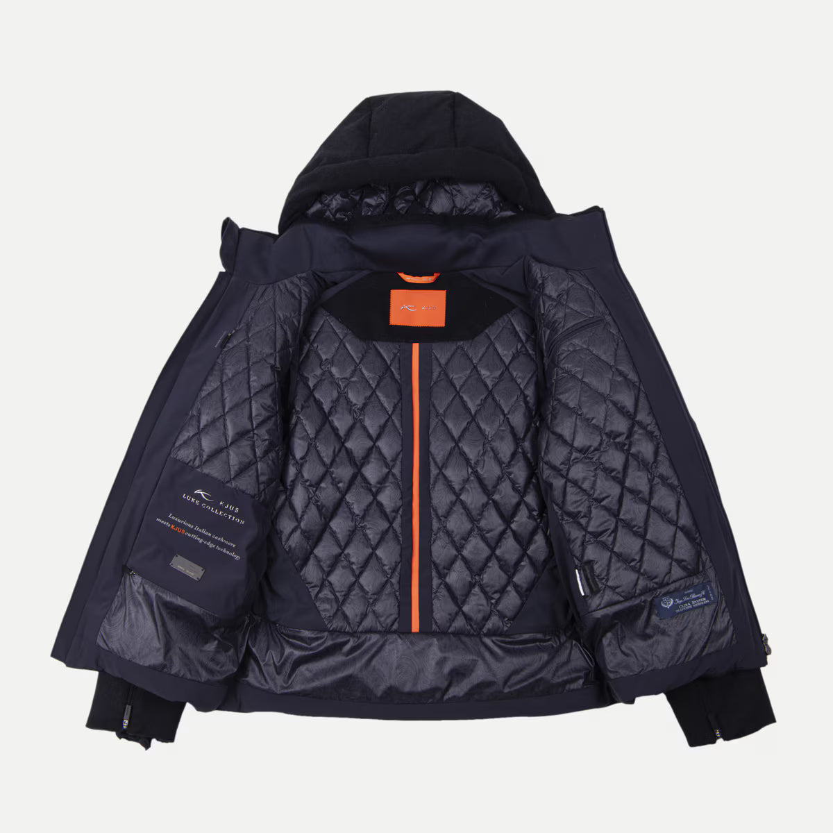 Wrap yourself in opulent warmth and innovation with this KJUS Orange Label jacket, crafted from luxurious Loro Piana cashmere fabric made in Italy. Enhanced with graphene lining for superior thermoregulation, its breathable, four-way stretch provides unmatched comfort and mobility. Keep your phone's battery warm with the graphene-lined pocket and enjoy moisture renewal cuffs for added skin hydration. The Hideaway snow skirt ensures a seamless transition from the slopes to everyday life, making this jacket perfect for any adventure.